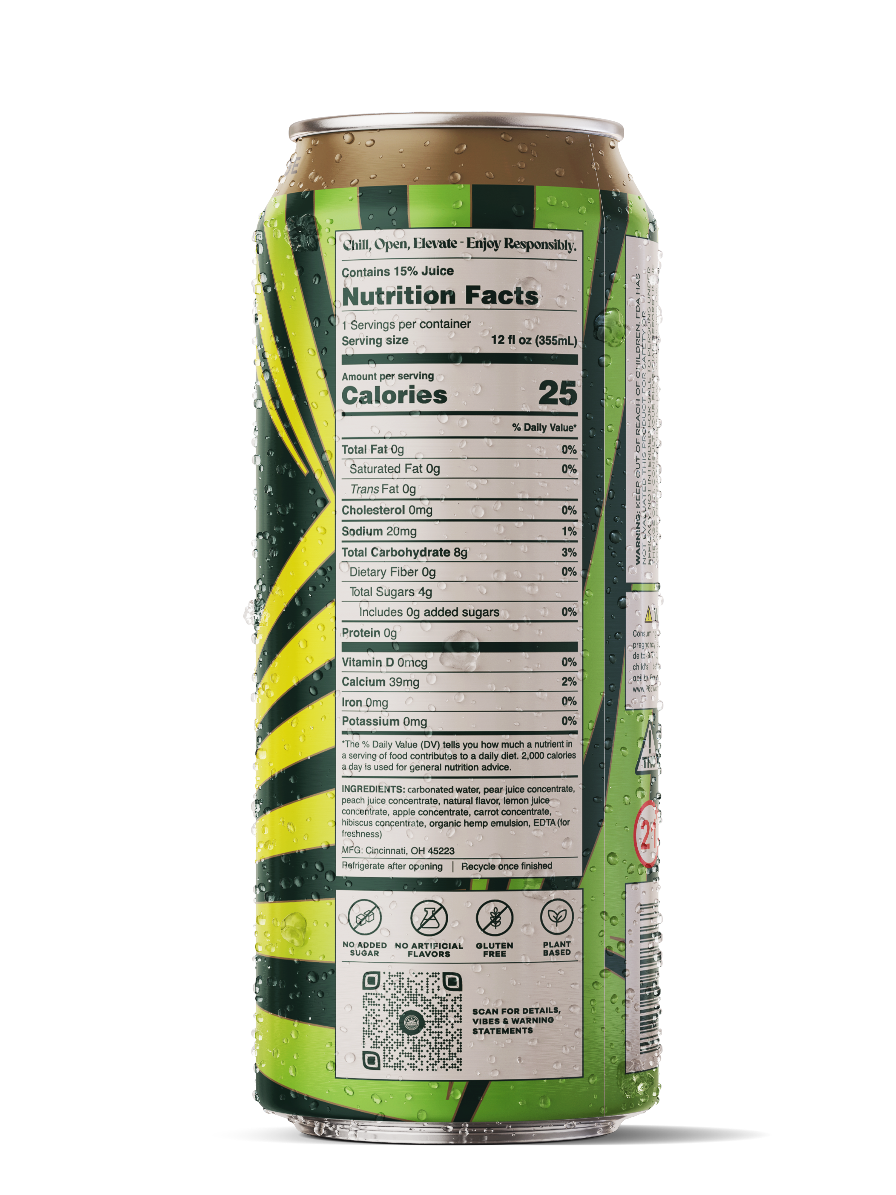 Outside of the lightly carbonated water, each serving contains vibrant, real fruit juice – a unique, complex blend for each flavor! We add in natural flavors and colors for an extra touch of magic. Then comes our superstar, our hemp emulsion, for a quick, clean, and consistent buzz that is not overwhelming. Lastly, a touch of EDTA works like a little freshness magic, keeping every can tasting crisp, clean, and just like we intended.