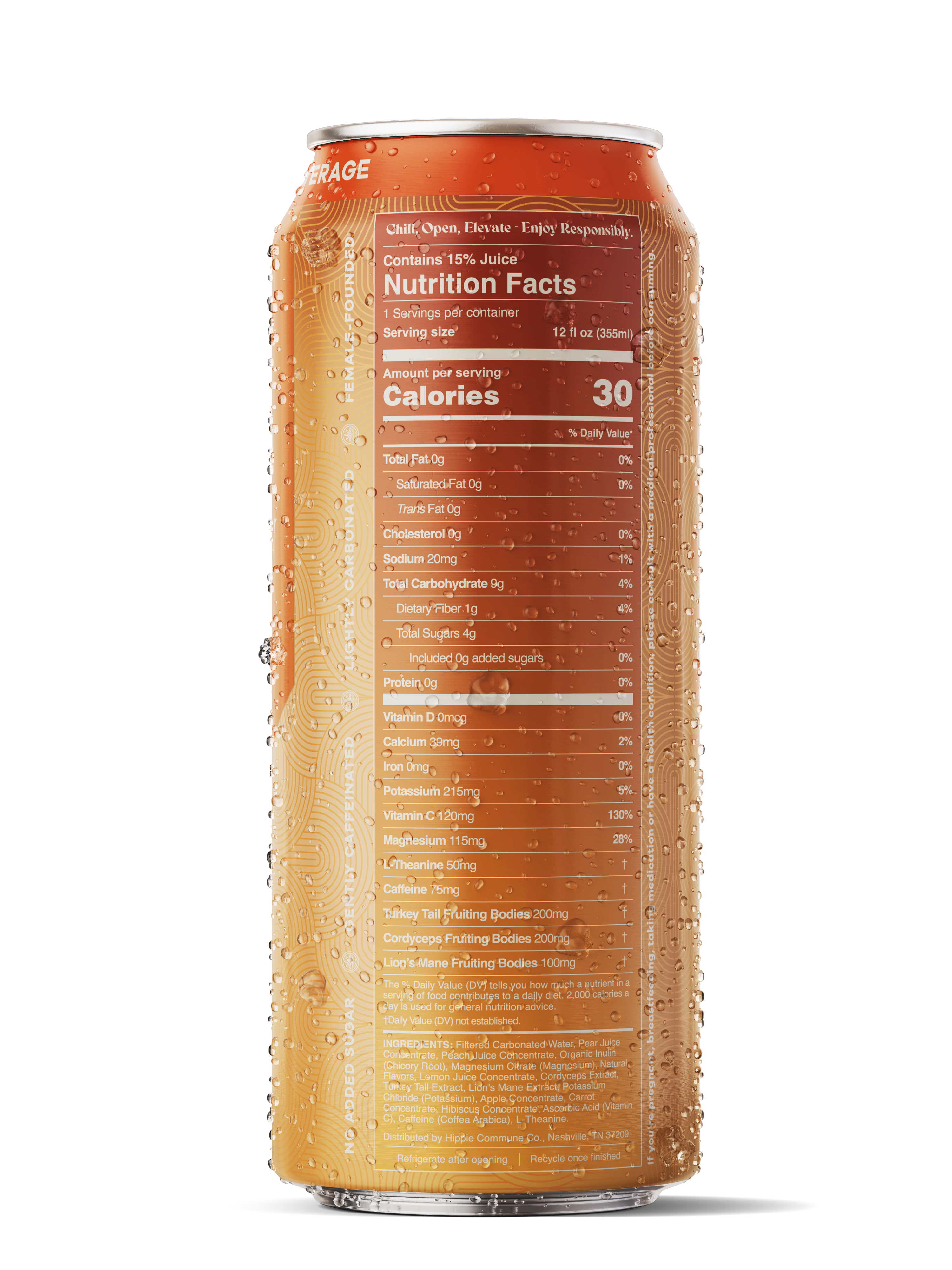A bright, lightly sparkling clean Energy Drink made with a blend of real fruit juice and functional ingredients designed to lift you up gently and keep you clear, focused, and steady. Made with 15% real fruit juice and powered by clean caffeine from Arabica coffee, functional mushrooms, and minerals that support hydration and focus, this refreshing sip delivers smooth energy without the crash.
