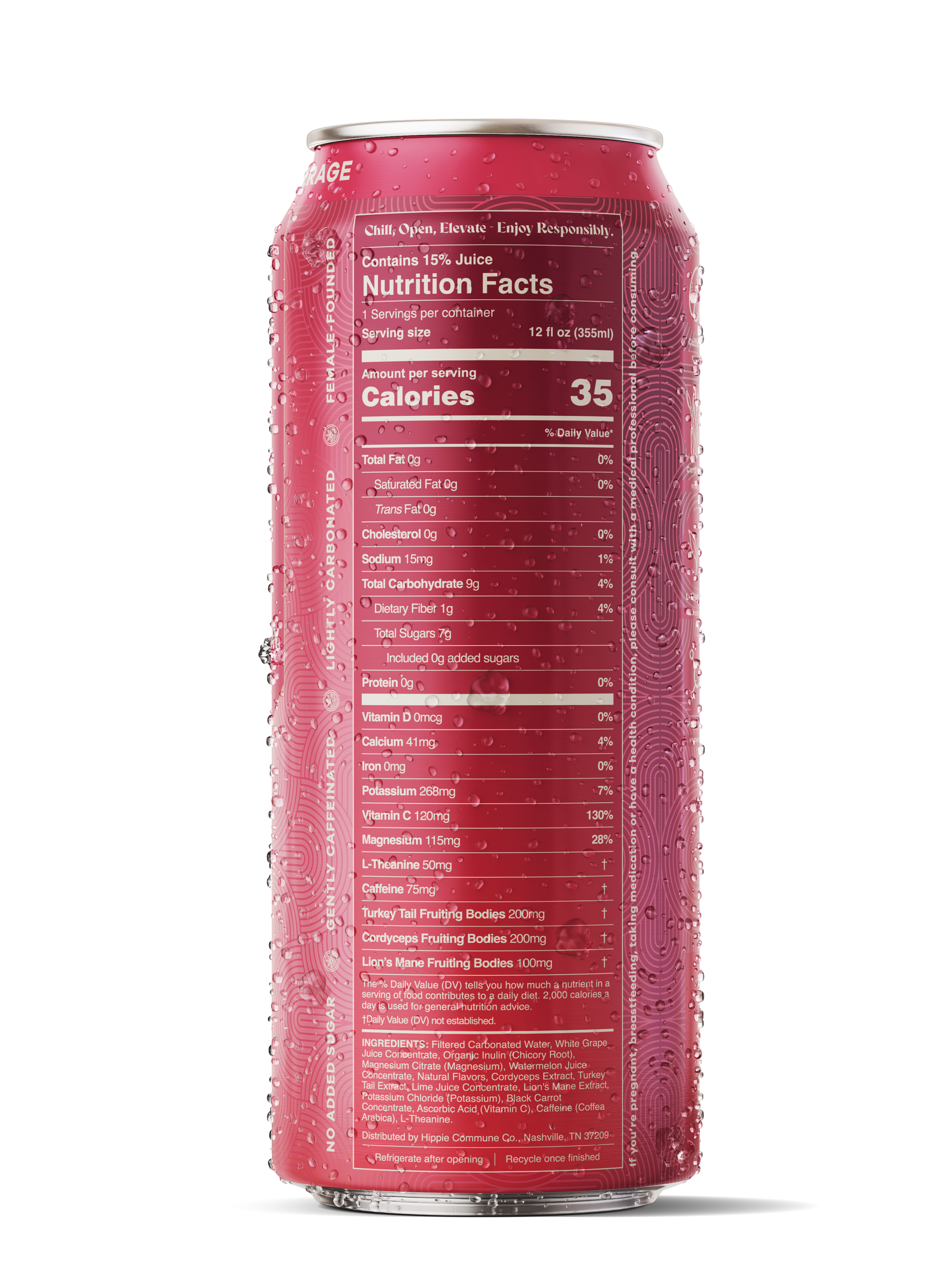 A bright, lightly sparkling clean Energy Drink made with a blend of real fruit juice and functional ingredients designed to lift you up gently and keep you clear, focused, and steady. Made with 15% real fruit juice and powered by clean caffeine from Arabica coffee, functional mushrooms, and minerals that support hydration and focus, this refreshing sip delivers smooth energy without the crash.